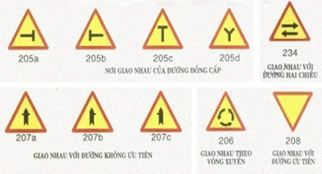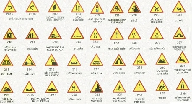Biển báo giao thông hình tam giác phổ biến thường đượng sử dung là biến báo nguy hiểm và biển báo cánh báo với mã biển số từ 201 đến 247 (trừ biển số 242, 243)
