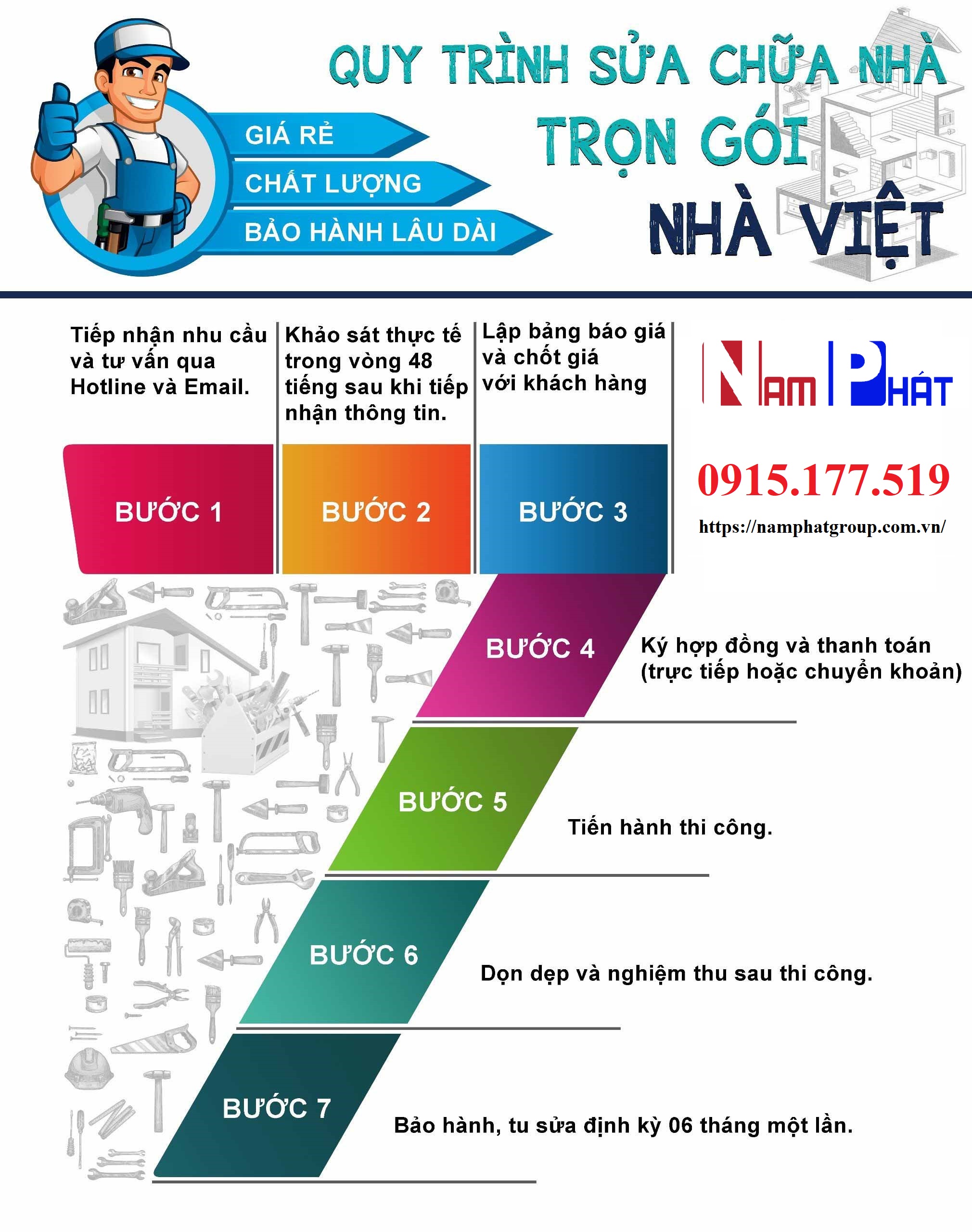 Nếu bạn là chủ doanh nghiệp, cần nâng cấp, sửa chữa nhà xưởng, nhà kho, văn phòng…vv… Hãy gọi cho chúng tôi theo Hotline: 0915.177.519, Nam Phát xin cam đoan về chất lượng dịch vụ tốt nhất cũng như giá cả hợp lý nhất.