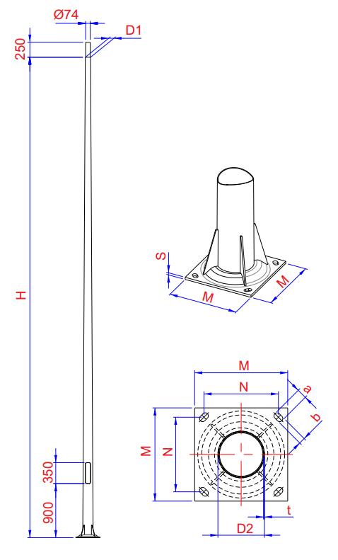 Trụ tròn 9m | NP – TC09 | 9 | 3 – 4 | 60-76-84 | 165-190 | 400 | 12 | 300×300 | M20-M24 |